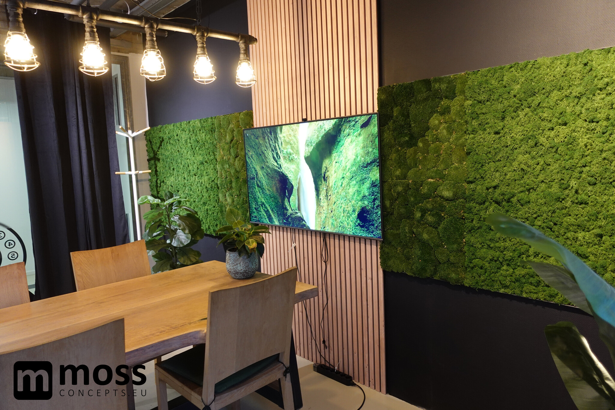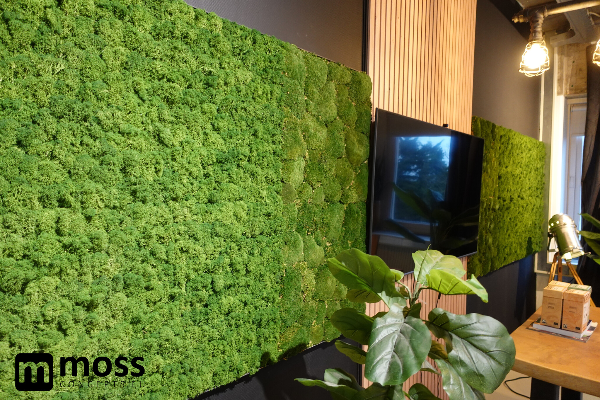 Akoestiek werking: Naast het feit dat een moswand sfeer verhogend werkt absorberen de mospanelen ook geluidstrillingen en verminderen ze het omgevingsgeluid. Wat zeer gunstig is in openbare ruimtes, drukke kantoren en woonkamers.