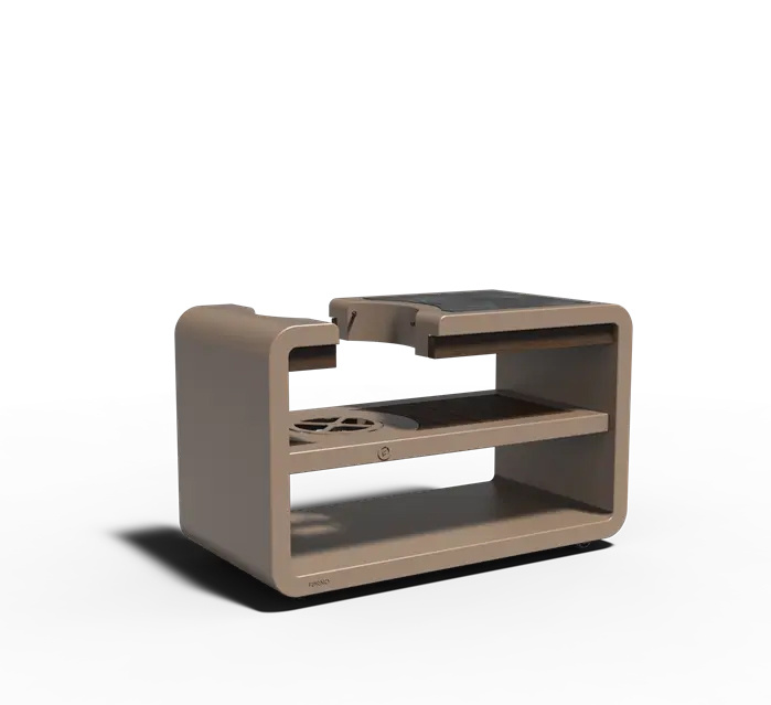 Het kamado station is afgewerkt met duurzaam bamboe hout. De mooie afgeronde hoeken en het cortenstaal geven het station een natuurlijk en Luxe uitstraling.