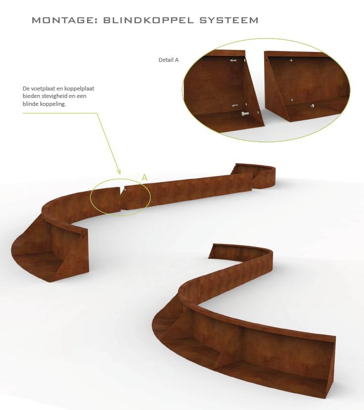 Plaatsing: de keerwanden zijn eenvoudig te plaatsen op een egale ondergrond. De elementen zijn te koppelen d.m.v. het blindkoppel systeem (zie montage tekening). De keerwanden worden geleverd inclusief hoogwaardige RVS bouten en moeren.