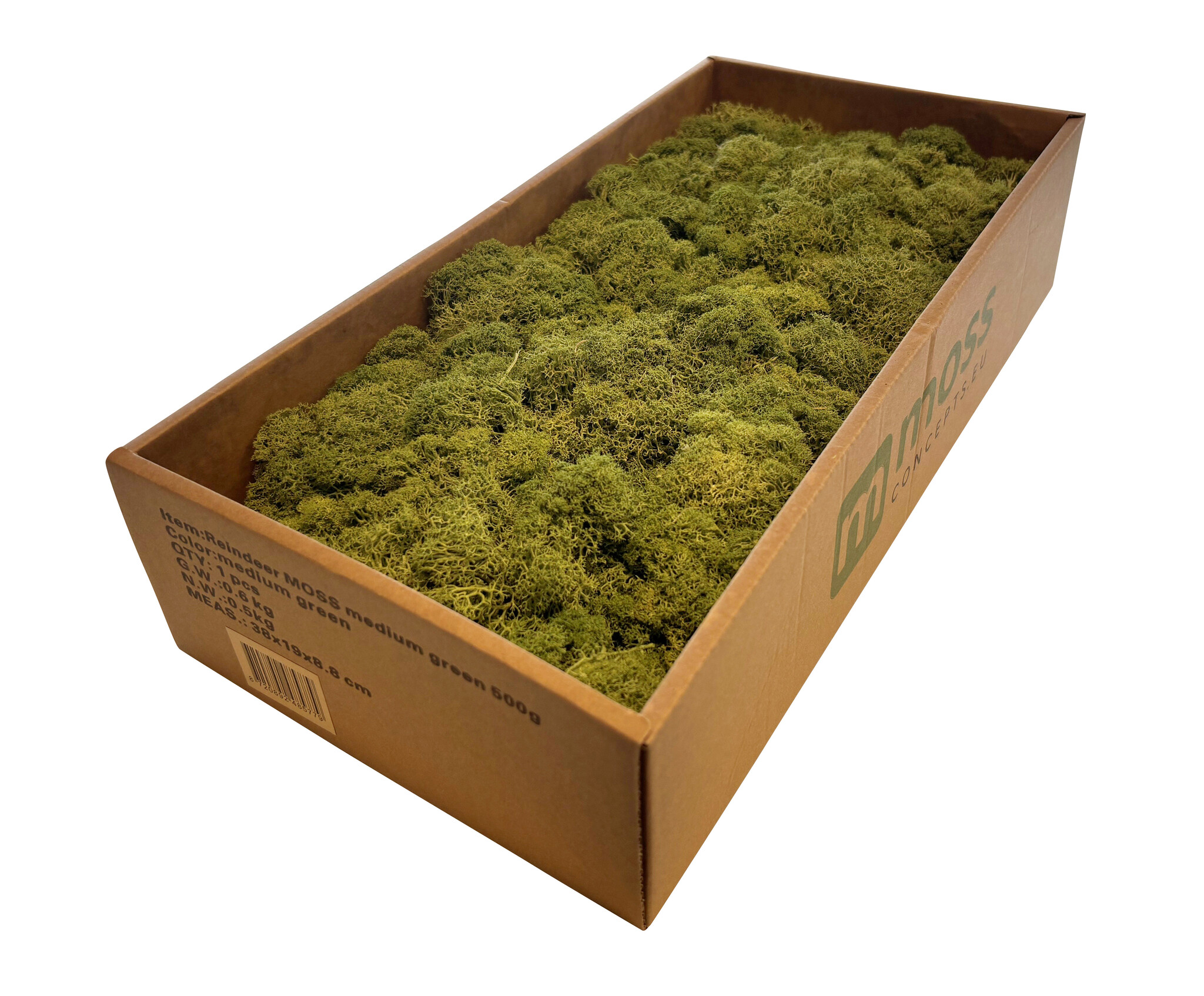 MOSS concepts rendiermos mediumgroen 500gram, met ons rendiermos kunt u de randen van onze MOSS concepts moswand panelen afwerken of bijvoorbeeld mooie bloemstukjes maken!