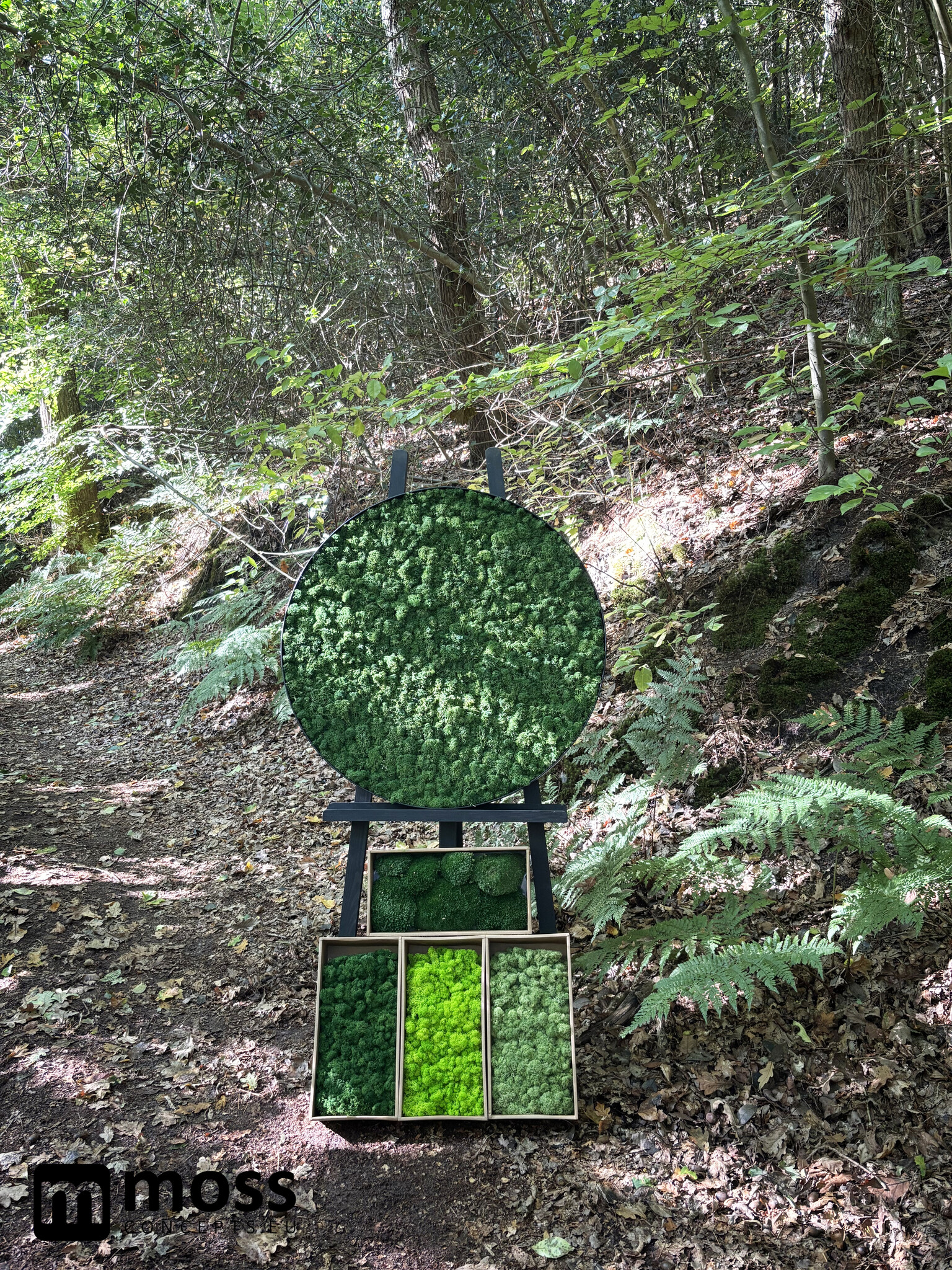 Rendiermos, Cladonia Stellaris, heeft veel kleine gewijvormige vertakkingen en een heel zacht, glooiend uiterlijk. Een kader of wand in dit mos lijkt op een boslandschap vanuit de hoogte, met allemaal topjes in verschillende vormen. Door deze vertakte structuren is het mos ideaal als akoestisch paneel - geluidsgolven worden geheel geabsorbeerd.