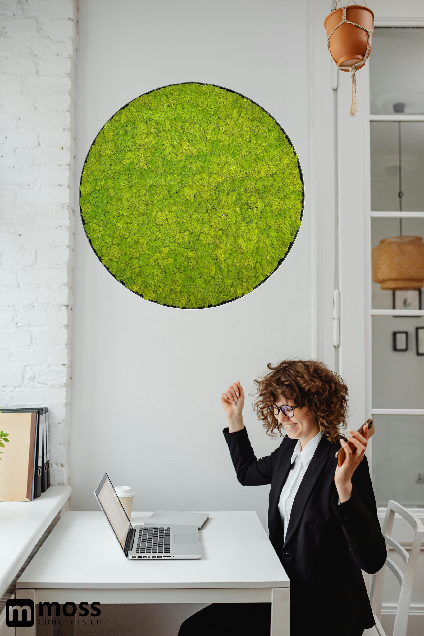 MOSS concepts Mosschilderij Linn Metal 120cm. is een prachtig rendiermos schilderij in de vrolijke kleur springgroen! Het mosschilderij heeft een prachtige metalen lijst met een luxe mat zwarte poedercoating!