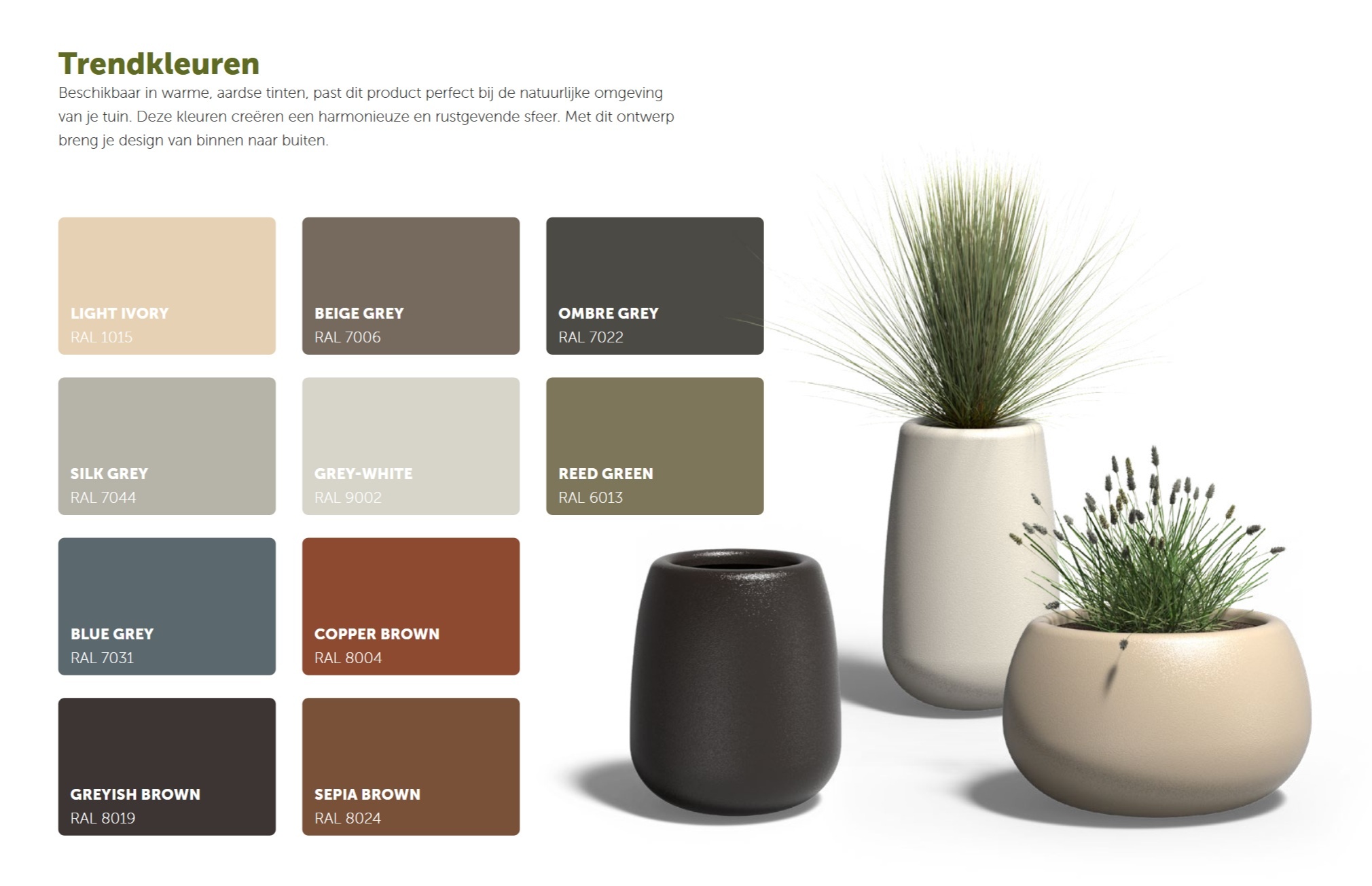 De standaard kleuren en de warme trend kleuren worden uit voorraad geleverd. De levertijd voor een maatwerk kleur kan 4-5 (werk)weken bedragen. Voor de actuele voorraad kunt u contact opnemen met de klantenservice. De kans is groot dat uw plantenbak in de gewenste kleur al op voorraad staat.