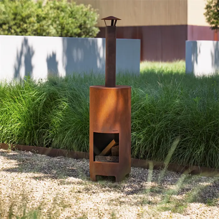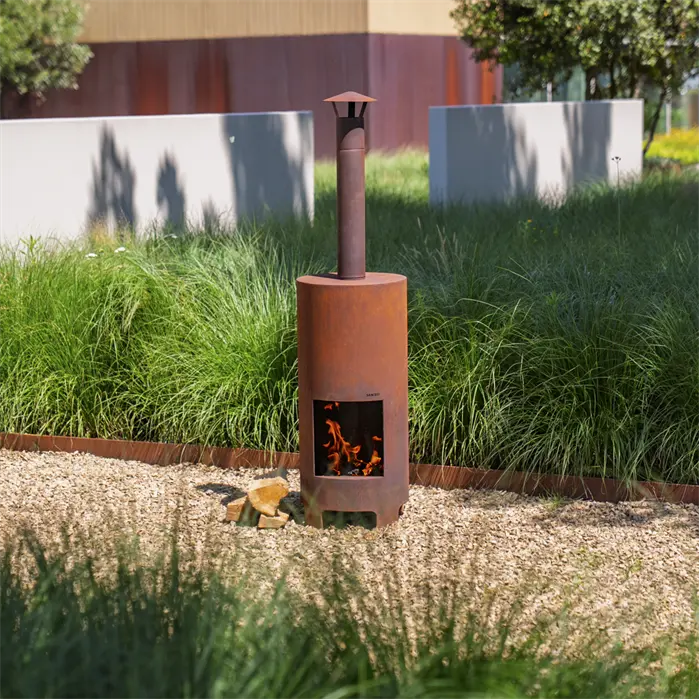 De tuinhaard dankt zijn kenmerkende karakter aan de beschermende roestlaag. Deze varieert van warm oranje tot roodbruin. Tegelijk geeft de kleur uw haard ook een eigenzinnig karakter. Met de warme uitstraling van hout en de industriële touch van staal.