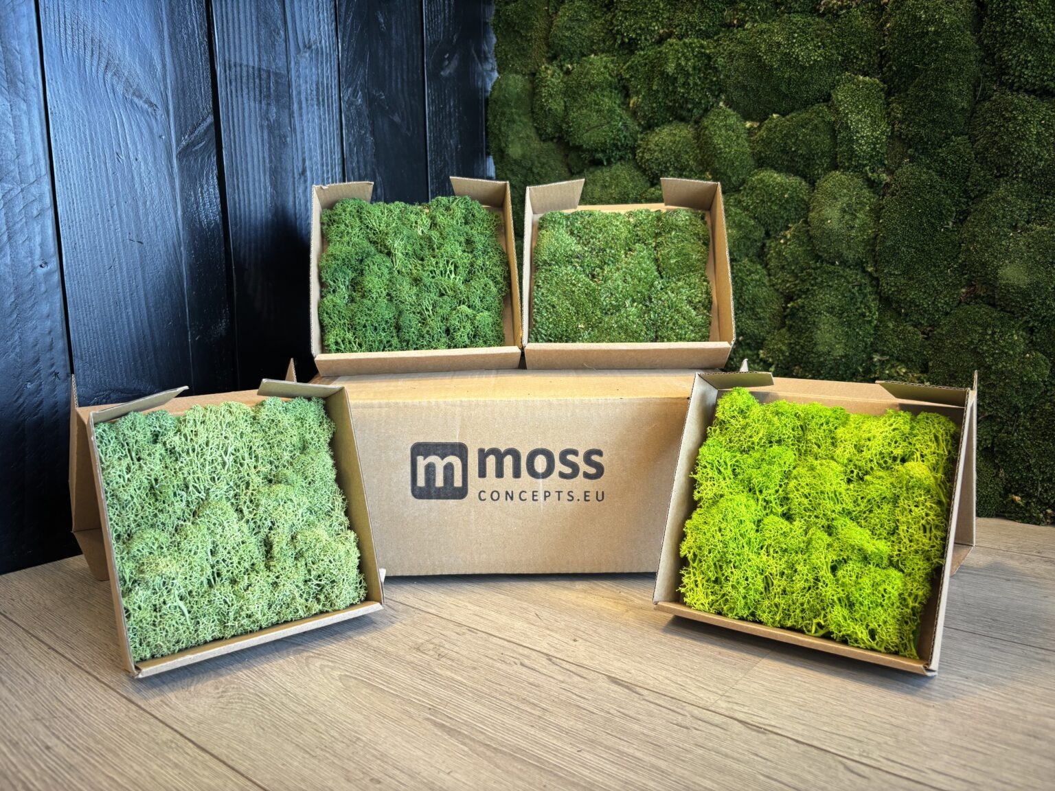 Rendiermos, Cladonia Stellaris, heeft veel kleine gewijvormige vertakkingen en een heel zacht, glooiend uiterlijk. Een kader of wand in dit mos lijkt op een boslandschap vanuit de hoogte, met allemaal topjes in verschillende vormen. Door deze vertakte structuren is het mos ideaal als akoestisch paneel - geluidsgolven worden geheel geabsorbeerd. De meest felle kleur is het Spring groen rendiermos, met natuurlijke pigmenten gekleurd. Een natuurlijkere variant is het mosgroen, dit is de meest gekozen tint in rendiermos vanwege zijn frisgroene kleur en mooie egale, kussenvormige topjes.